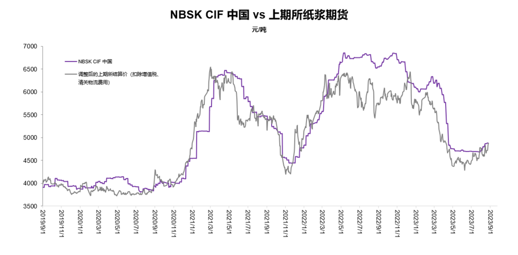 8月25日,上期所纸浆期货主力合约SP2401结算价为5,626元/吨,较上周大涨184元/吨。扣除增值税和物流成本为668美元/吨。